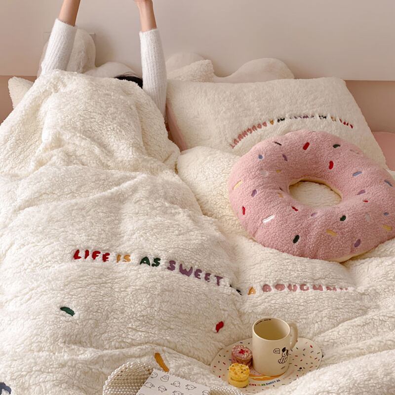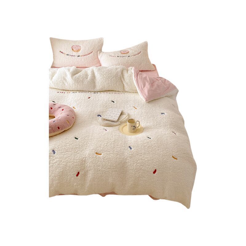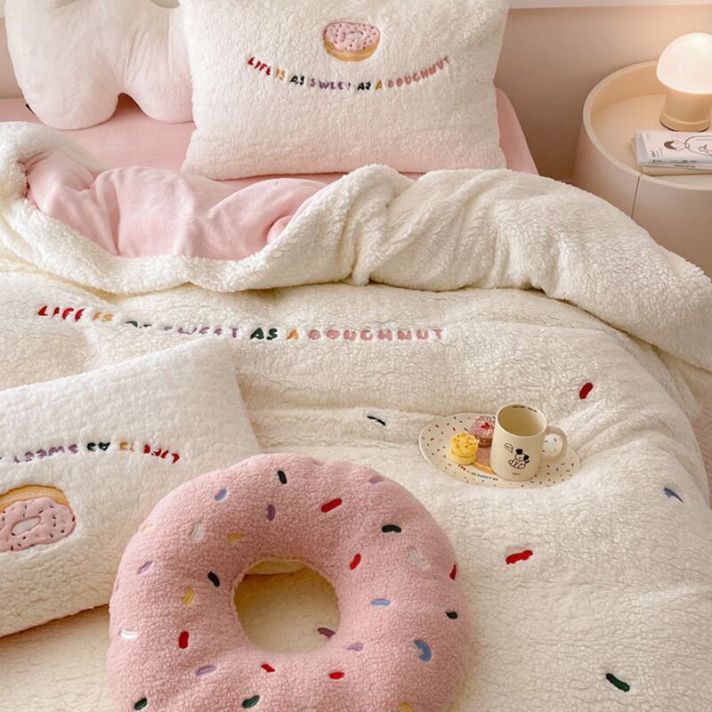 【SHEETSET】秋冬厚さラムフリース刺繍ベッドカバーセット ドーナツクッション付き
